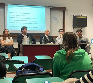 El equipo también abordó los desafíos y oportunidades que plantea la era digital para el periodismo y la comunicación. Nicolas Nasif analizó el concepto de “muro de pago” y cómo este modelo de monetización del contenido informativo puede limitar el acceso al material; y como este “muro” permite personalizar la información que les llega a los usuarios suscritos, lo cual se convierte en lo que él llamó una “estrategia comercial”. Por su parte, Lucas Enzo Perez presentó una mirada técnica sobre cómo se recopilan y seleccionan los datos necesarios para llevar a cabo un proyecto de comunicación. De esta manera la comunicación se convierte en un proceso, acompañado de tecnología y matemática que permiten almacenar testimonios, bibliografía información etc.