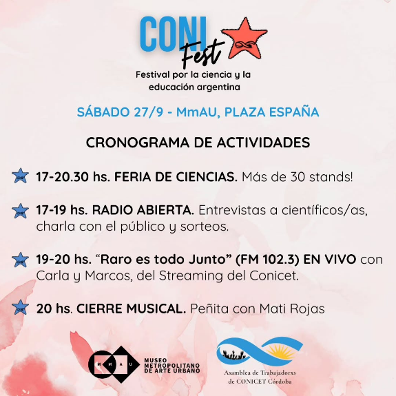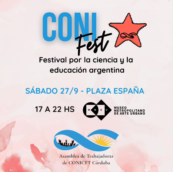 La Asamblea de Trabajadorxs de CONICET está organizando ConiFest, un festival de ciencia, educación y entretenimiento que se realizará el sábado 27 de septiembre de 17 a 22 en el Museo Metropolitano de Arte Urbano (MMAU), Plaza España, de la ciudad de Córdoba. Habrá puestos interactivos, música en vivo, teatro, juegos y charlas con científicos. La entrada es libre y gratuita.