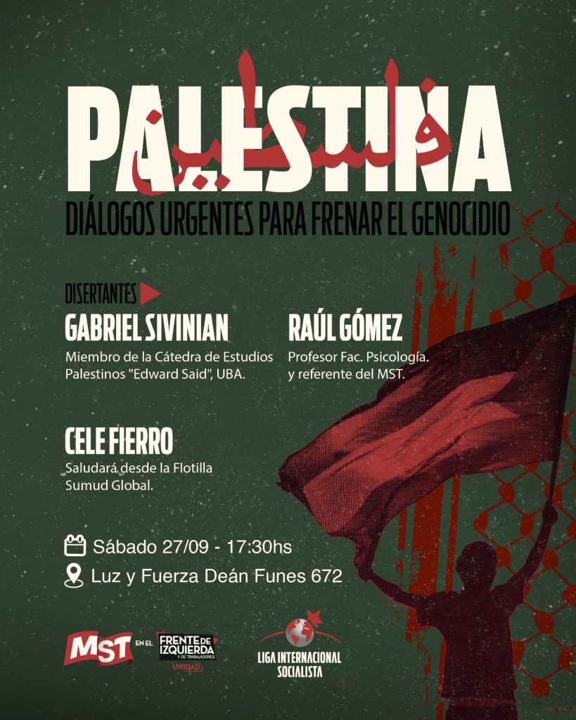 – Nosotros vamos a hacer una charla el 27 de septiembre en Deán Funes 672 a las 17:30 donde va a venir Gabriel Sivinian (miembro de la Cátedra de Estudios Palestinos “Edward Said”, UBA), Raúl Gómez (profesor de la Facultad de Psicología de la UNC y referente del MST) y se conectará desde la flotilla Celeste Fierro (Diputada CABA por el FIT Unidad MST) . Vamos a hacer este tipo de actividades para todos los que estén interesados en conocer un poco más, la historia, sobre lo que está pasando bueno, que se acerquen.