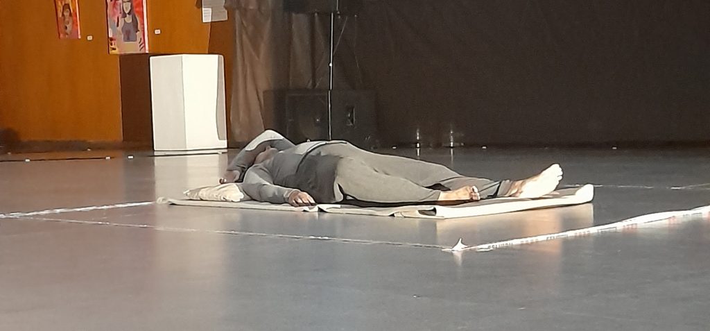“Después del Silencio” fue la tercera obra, interpretada y dirigida por la actriz Luciana Reiccholz. Su cuerpo yacía tendido en el suelo, sobre una almohada y una sábana, en una quietud que parecía estar dormida. De pronto, una voz robotizada irrumpió en la escena y la despertó. Ella reaccionó con desesperación, como si le faltara el aire. La ansiedad, los nervios y la angustia se apoderaron de su cuerpo. Su grito fue tan intenso que pareció hacer vibrar los vidrios del techo del museo. El público permanecía en un silencio total, miraban con mucha curiosidad. Querían saber qué era lo que estaba pasando, qué era lo que le estaba sucediendo.