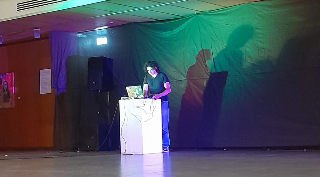 La cuarta obra fue Distopía, una fascinante combinación de danza y música en vivo, generada por un artista que mezclaba canciones (propias y de otros artistas) usando su computadora y una consola de sonido. El DJ logró generar un ambiente sonoro con una gran transición fluida entre temas, manteniendo un ritmo y una energía particular. Mientras tanto, en escena otro artista deleitaba al público con su majestuosa danza.