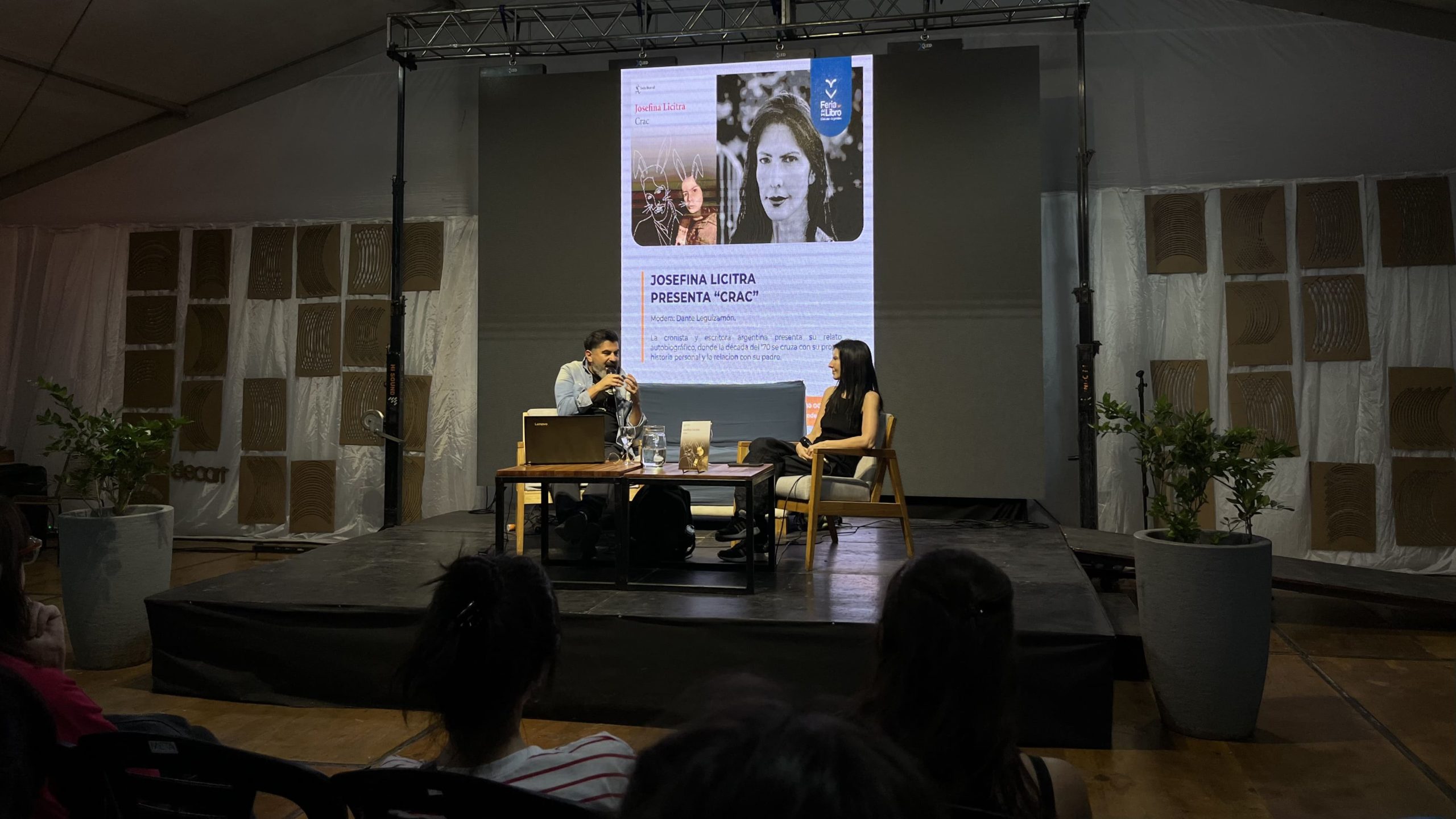 En la carpa magenta, tanto señoras mayores como treintañeros esperan aferrados a sus copias en las primeras filas de sillas plásticas. Algunos visitantes comienzan a asomarse en las aberturas a espiar curiosos por aquel relato personal que Dante Leguizamón, el moderador, recita con puro histrionismo: confiesa que el libro que presenta lo tuvo en vela toda la noche anterior.