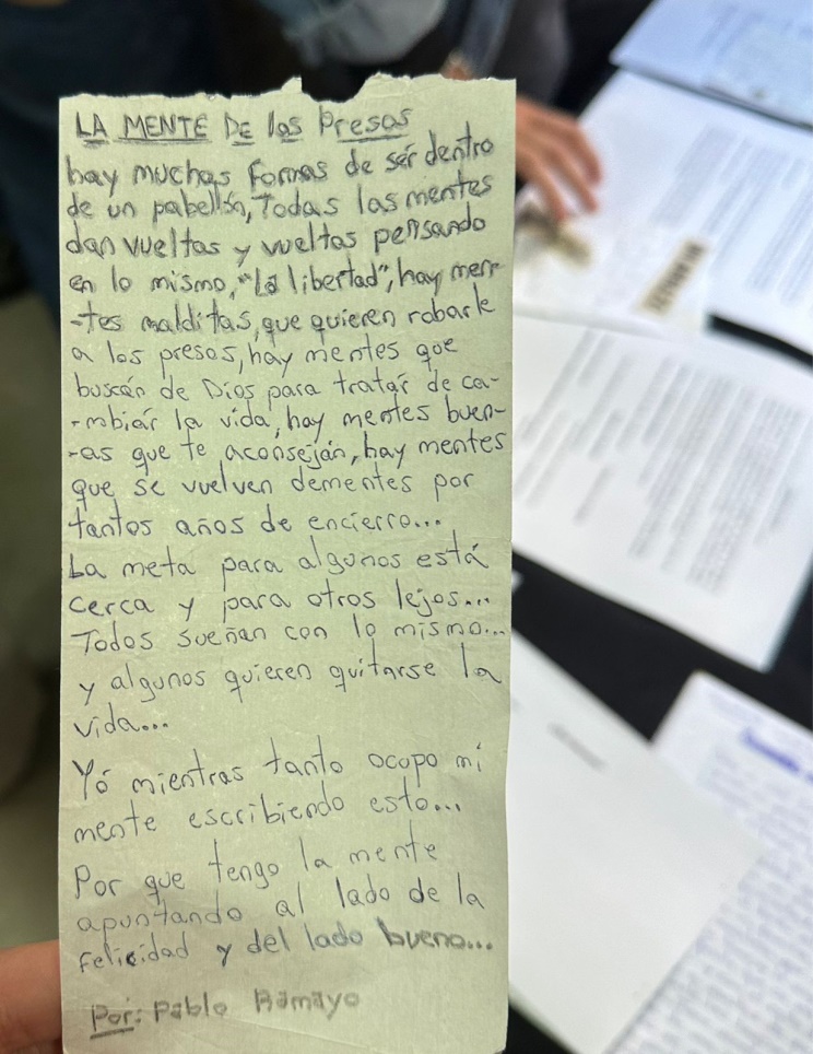 Uno de los escritos que más impactó a los asistentes fue el de Pablo Ramayo, un interno de Bouwer, que narra la cruda vida dentro del penal: “Hay muchas formas de ser dentro de un pabellón. Todas las mentes dan vueltas y vueltas pensando en lo mismo: La libertad. Hay mentes malvadas que quieren robarle a las presas, hay mentes que buscan de Dios para tratar de cambiar la vida, hay mentes buenas que te aconsejan, hay mentes que se vuelven dementes por tantos años de encierro… Yo mientras tanto ocupo mi mente escribiendo esto… Porque tengo la mente apuntando al lado de la felicidad y del lado bueno”.